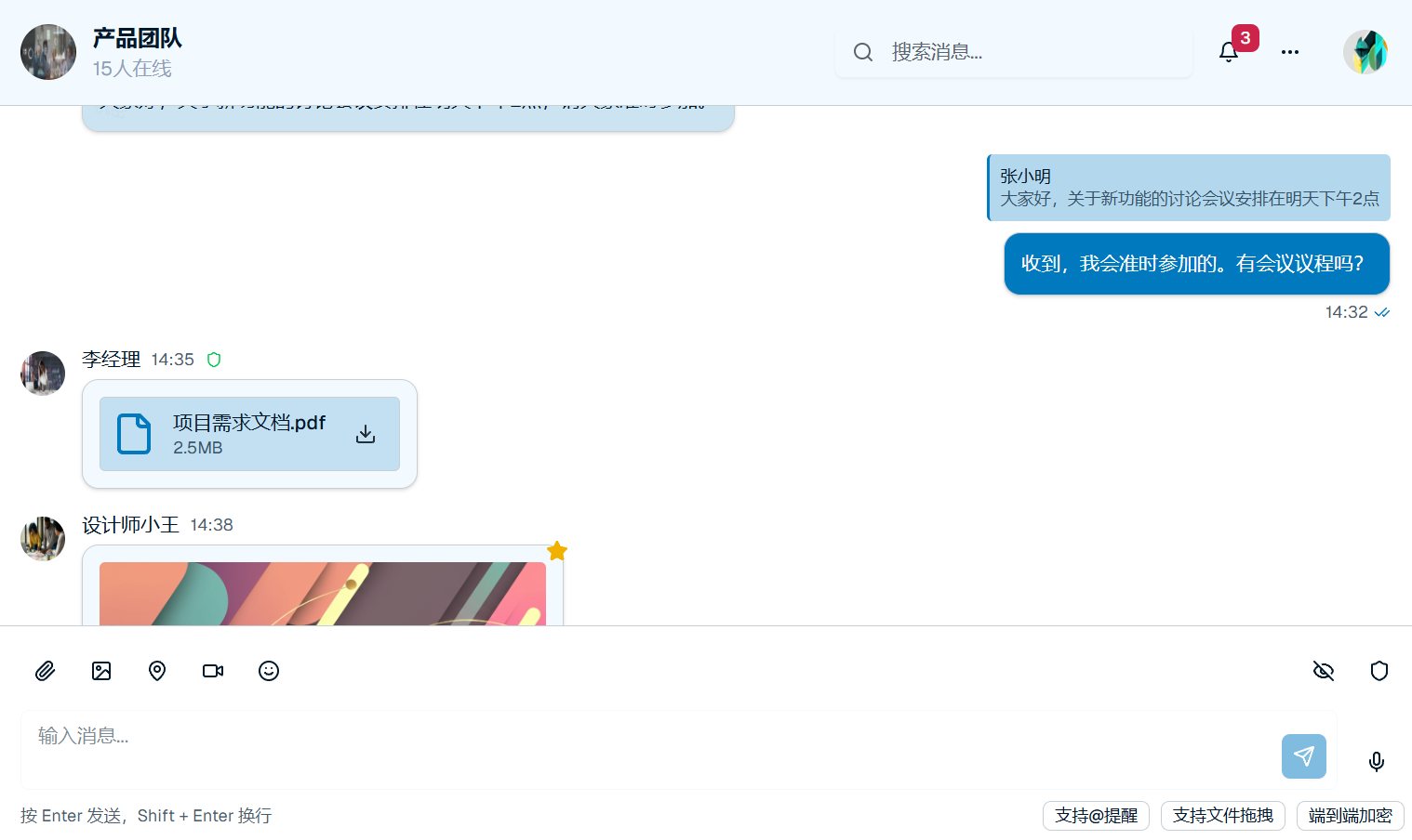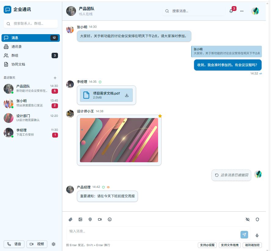 具备引用回复、收藏、撤回、消息未读回执等多种会话功能。