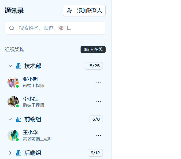 成员采用实名制,可快速定位,职员在线状态清晰可见。